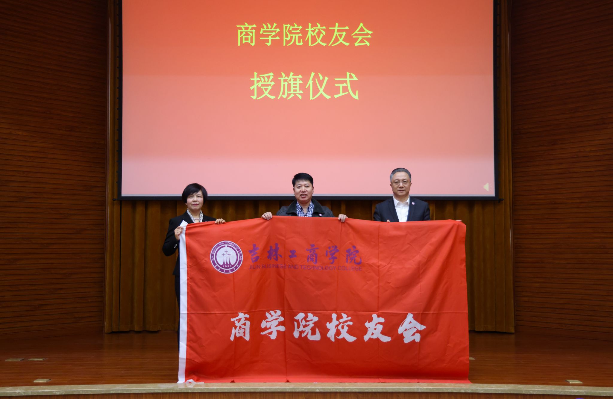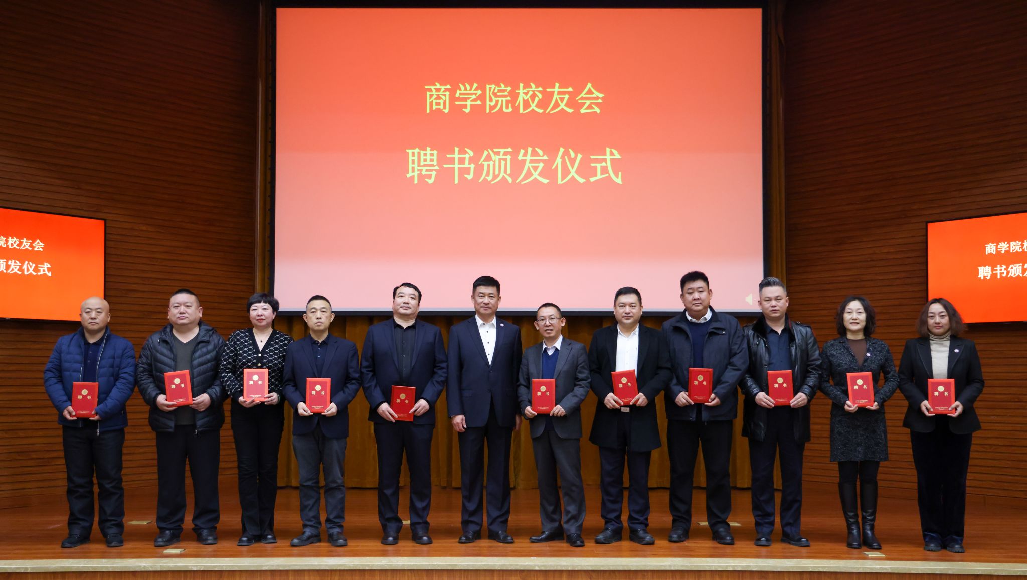 张越杰为商学院校友理事会名誉会长、会长、执行会长颁发聘书。杜希刚为商学院校友理事会副会长颁发聘书。徐文为商学院校友会授旗。李叔宁为商学院校友理事会秘书长、副秘书长颁发聘书。商学院原副院长岳会志为商学院校友理事会理事颁发聘书。