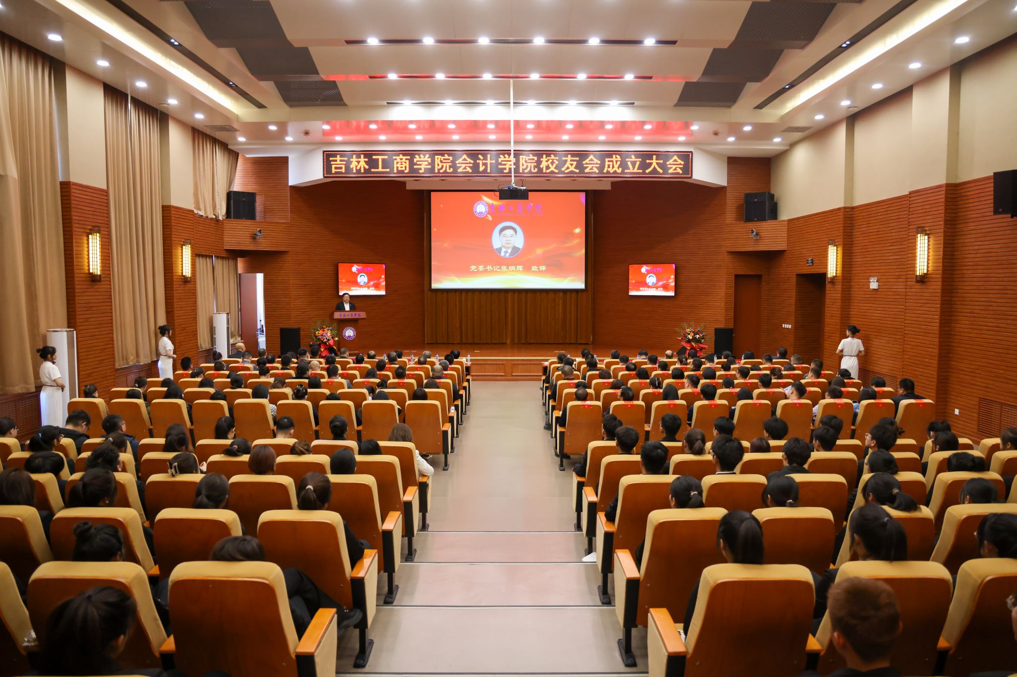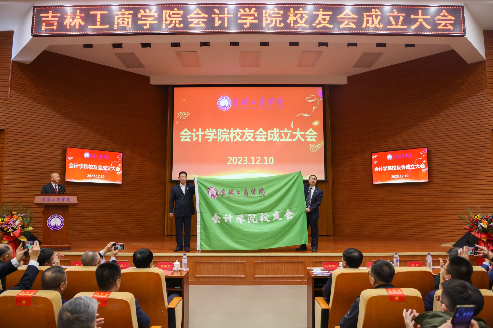 12月10日,吉林工商学院会计学院校友会成立大会在第二教学楼A区429报告厅举行。学校党委书记张炳辉,党委副书记、校长张越杰,党委副书记迟柏龙出席大会。学校校友工作办公室等相关职能部门代表、会计学院全体教职员工、来自全国各地的优秀校友代表以及学生代表共计260余人参加了大会。会计学院党委书记翟世春主持大会。