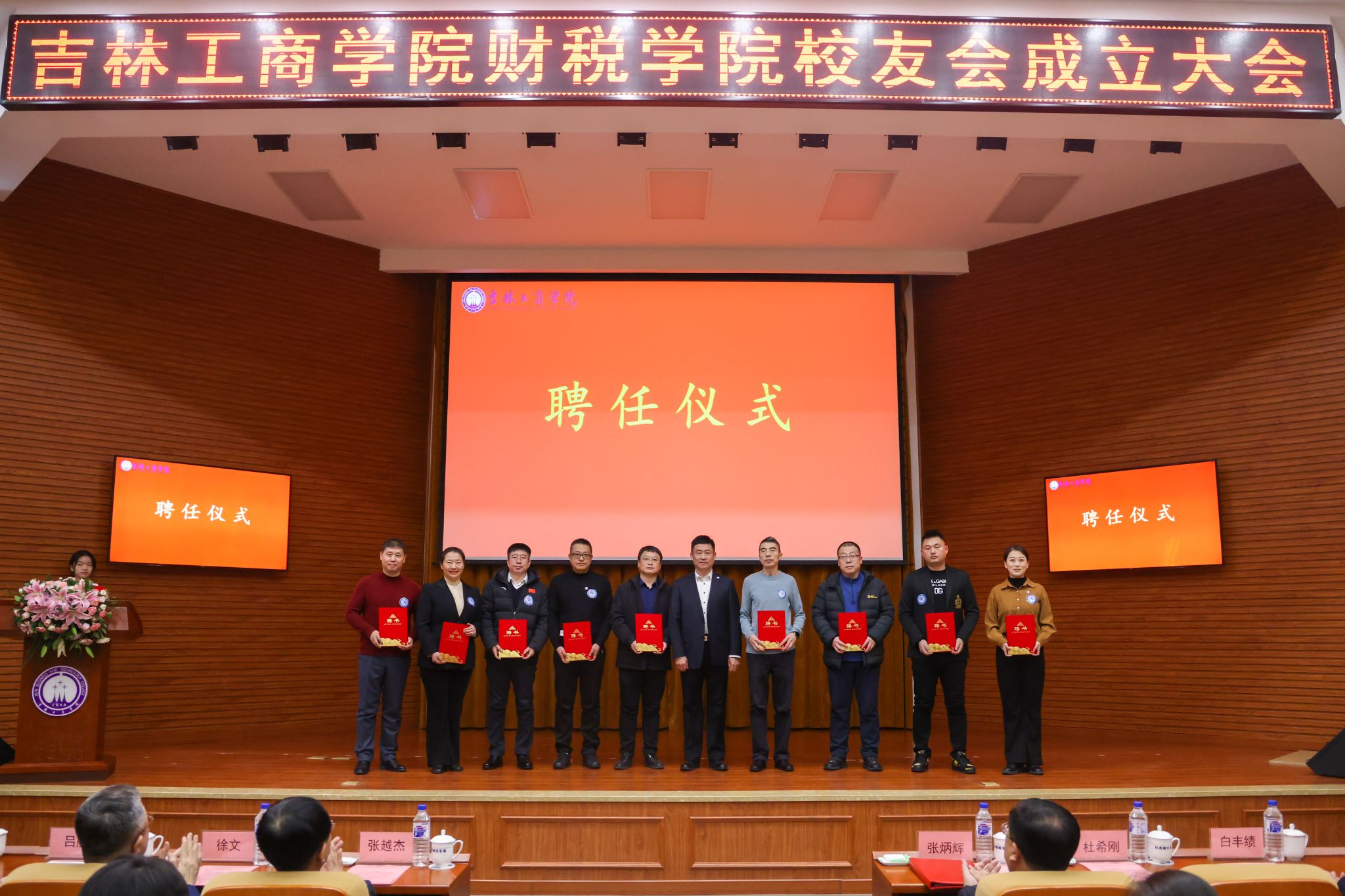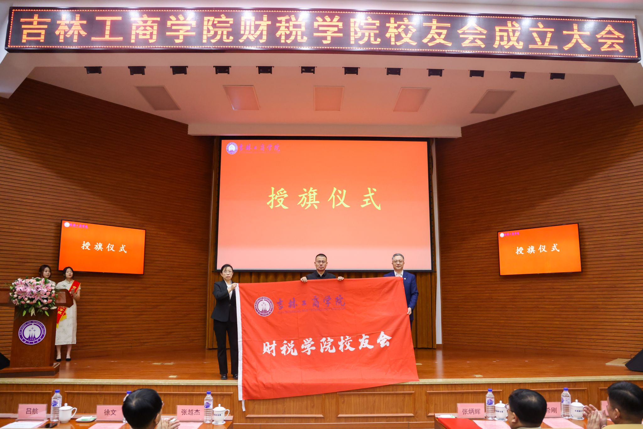 张越杰为财税学院校友会理事会会长、名誉会长和执行会长颁发聘书。杜希刚为财税学院校友会理事会副会长颁发聘书。徐文为财税学院校友会授旗。