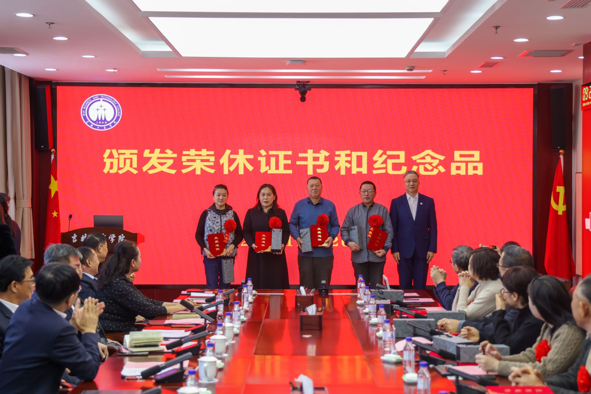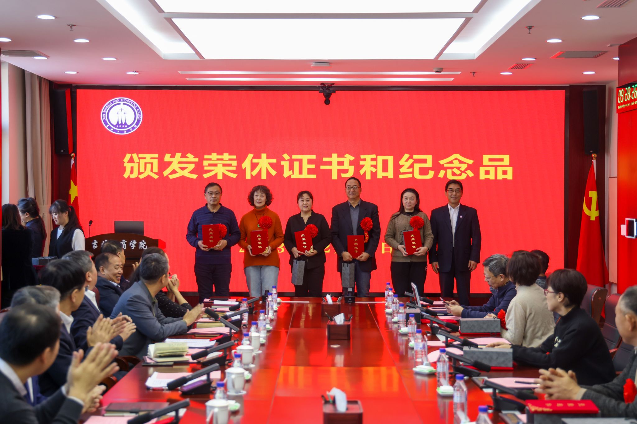 在充满温情与感动的氛围中,张越杰、迟柏龙、徐文依次为到会的十七位退休同志代表颁发荣休证书和纪念品,表达学校对他们的感谢与祝福。