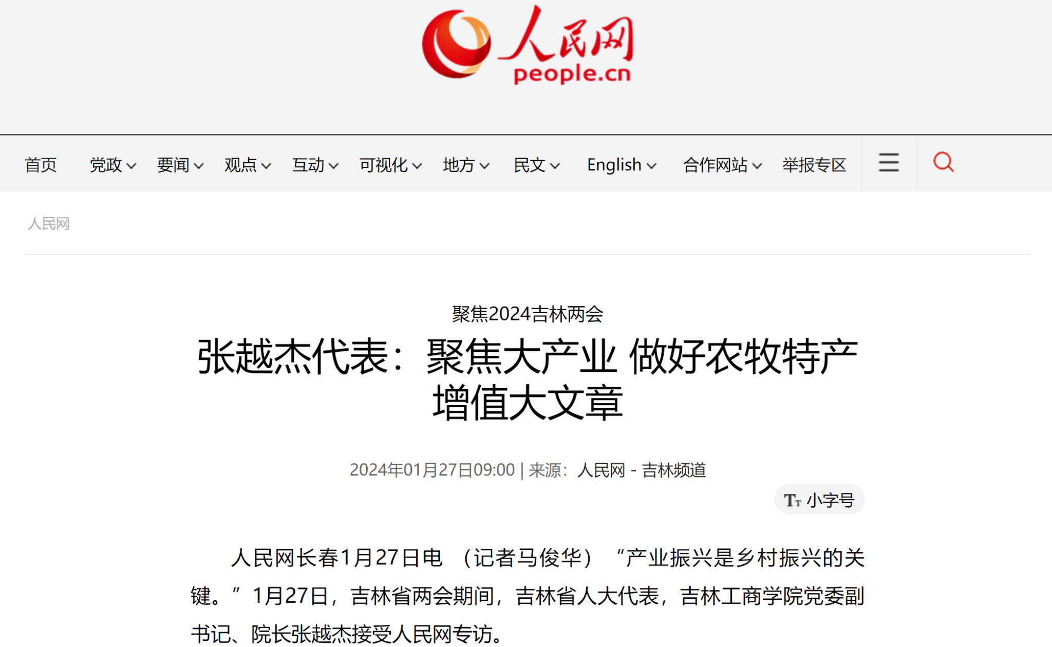 1月24日,吉林省第十四届人民代表大会第三次会议在长春开幕。会议期间,省人大代表,民族侨务外事委员会委员,我校党委副书记、校长张越杰围绕《政府工作报告》中提出的“坚持以发展现代化大农业为主攻方向,有力有效推进乡村全面振兴”等2024年工作任务,积极建言献策,履职尽责,接受人民网和吉林日报等新闻媒体采访,展现吉林工商学院人良好的精神风貌,贡献吉林工商学院人的智慧和力量。