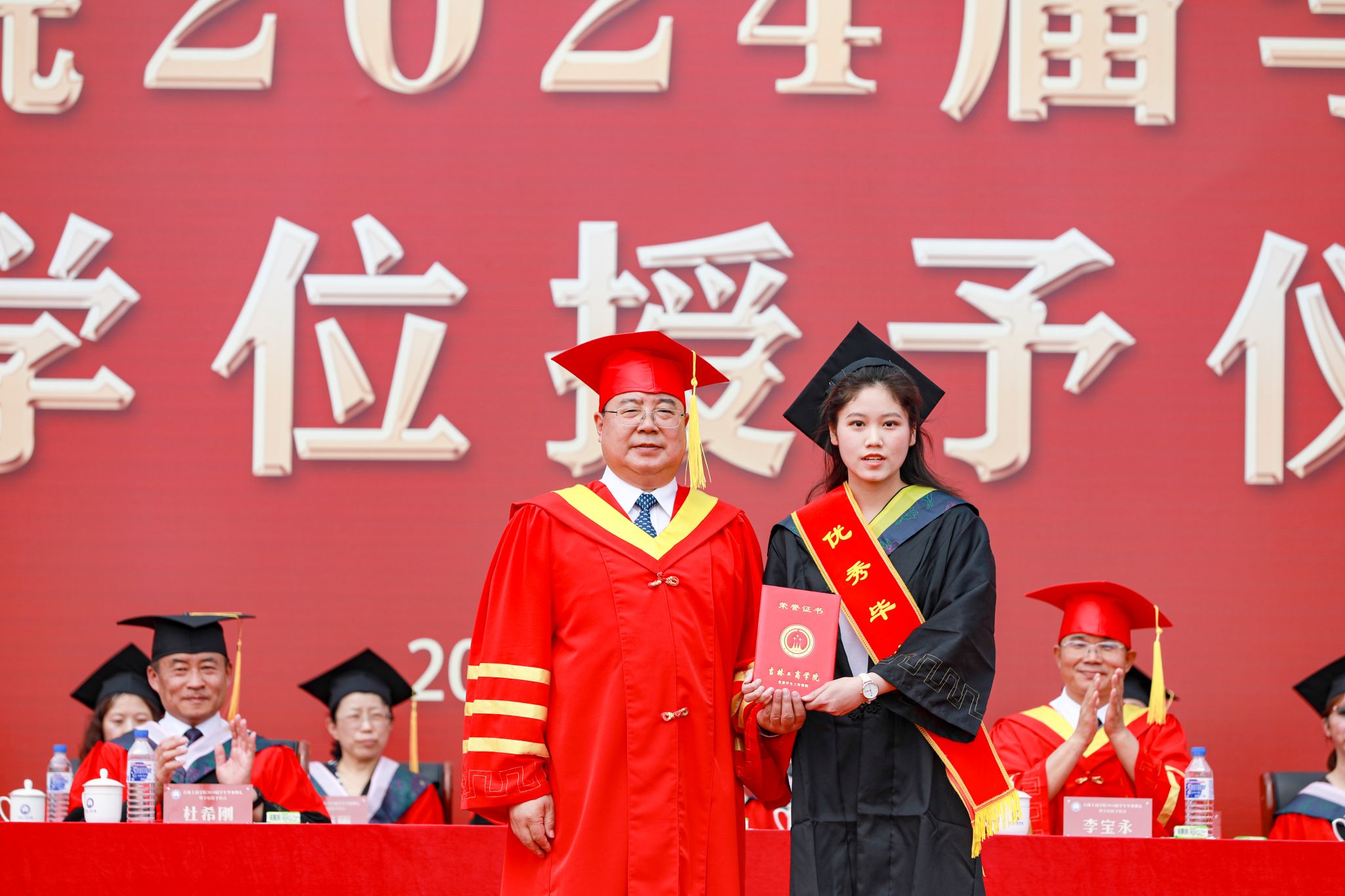 全体校领导及校友代表为2024届毕业生代表颁发毕业证书。