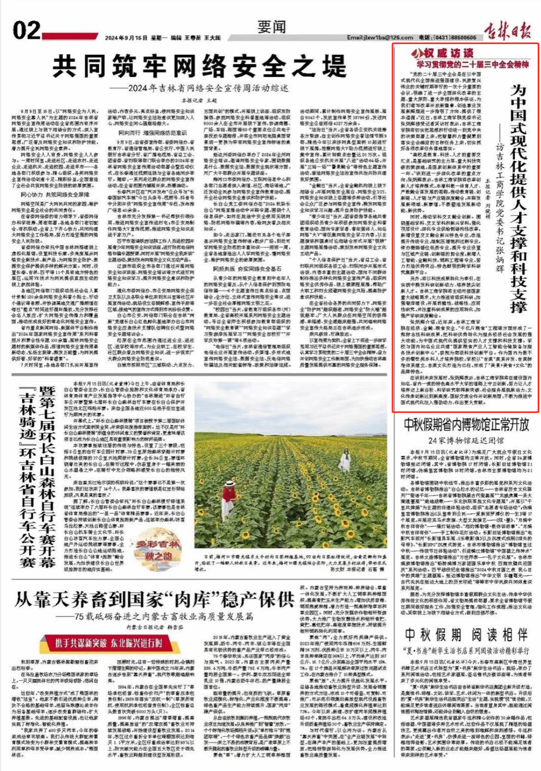 9月16日,《吉林日报》要闻版、《吉林日报》彩练新闻以《为中国式现代化提供人才支撑和科技支撑——访吉林工商学院党委书记张炳辉》为题进行报道,9月21日,吉林电视台“吉林新闻联播”“权威访谈”专栏以《张炳辉:以“财经”为底色 突出发展吉林“粮”“餐”特色》为题进行报道。